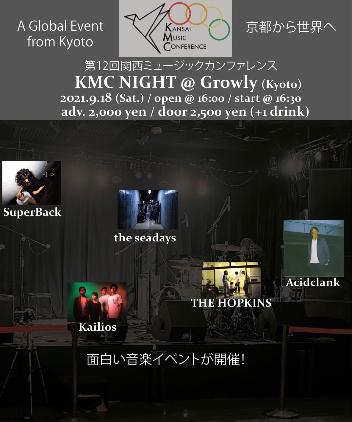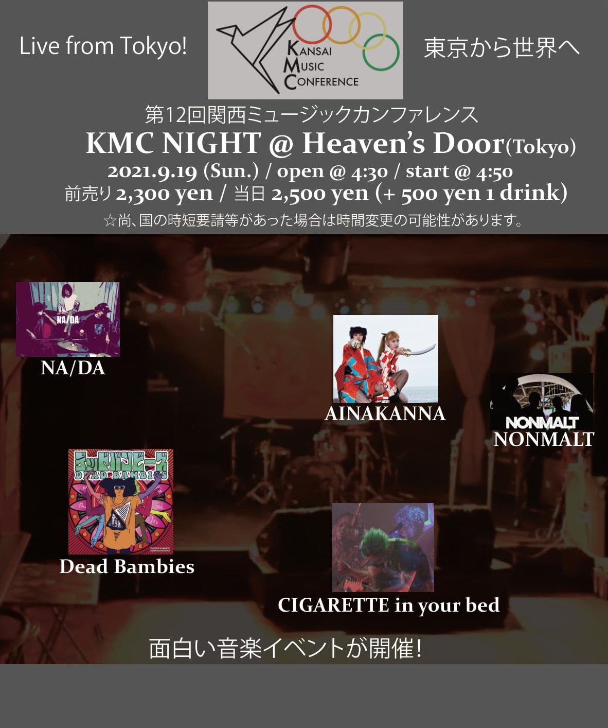 KMC NIGHTでは9/18・19の2日間、日本人アーティスト達が、ライブ会場で通常の(観客有りでの)生演奏を行い、同時にその演奏を国内外のオーディエンスに向けてそれぞれのアーティストのページ経由で生配信する計画です。